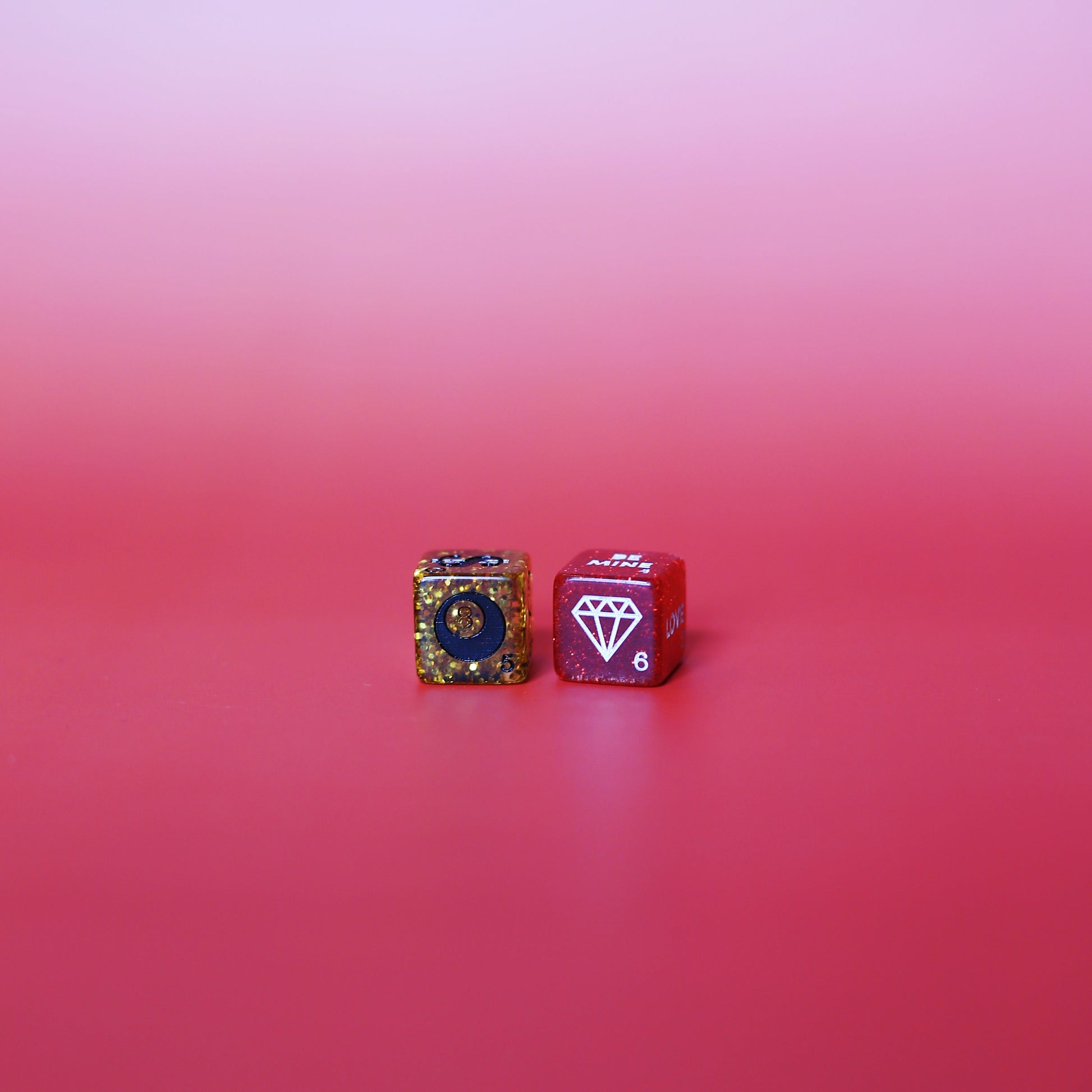 • 2 Custom Sparkle Dice (Red Sparkle + Yellow Sparkle)