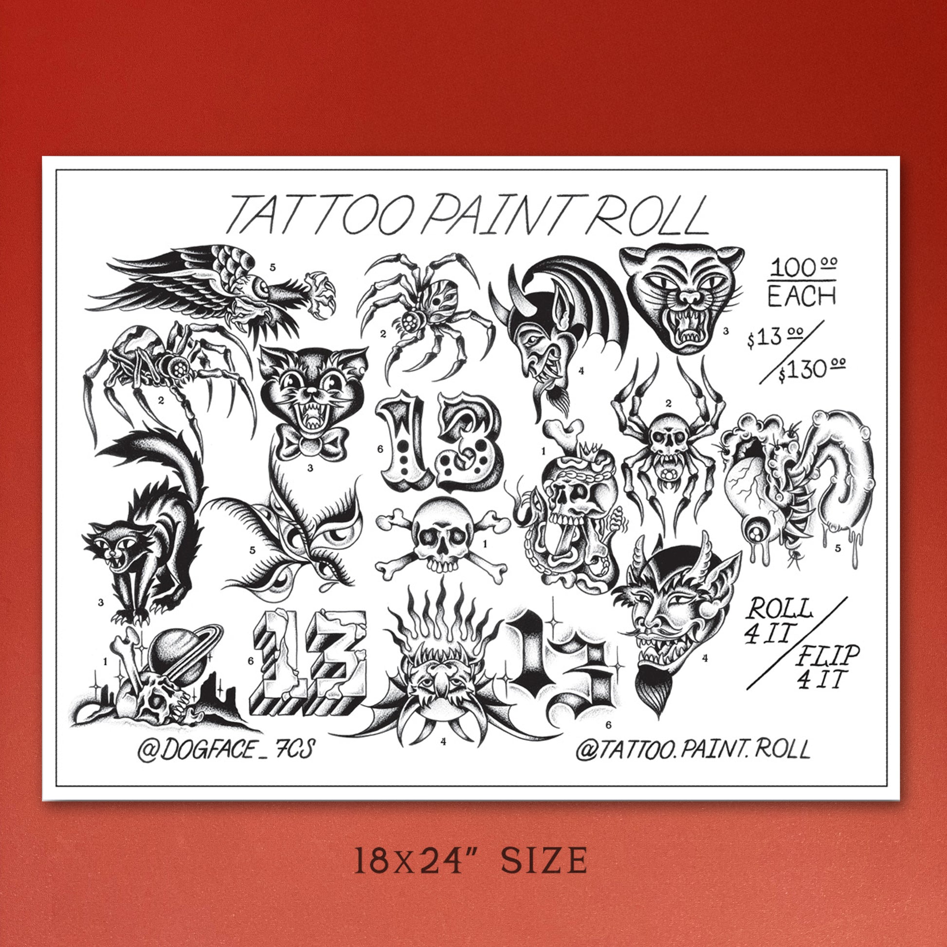 The included flash sheet was created using this very dice set by the legendary @dogface_7cs from @sevenseastattoosd in San Diego, CA—the birthplace of Tattoo Paint Roll! Printed with traditional offset printing, it brings that classic old-school authenticity to every sheet.